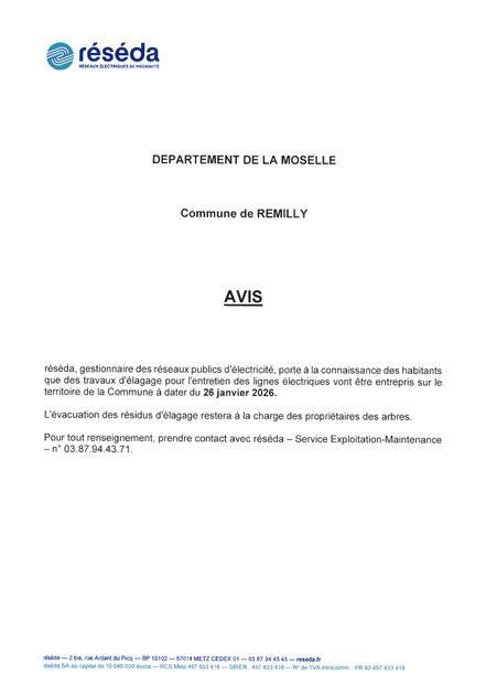 Travaux d'élagage par réséda, pour l'entretien des lignes électriques à dater du 26 janvier 2026. L'évacuation des résidus d'élagage restera à la charge des propriétaires des arbres.